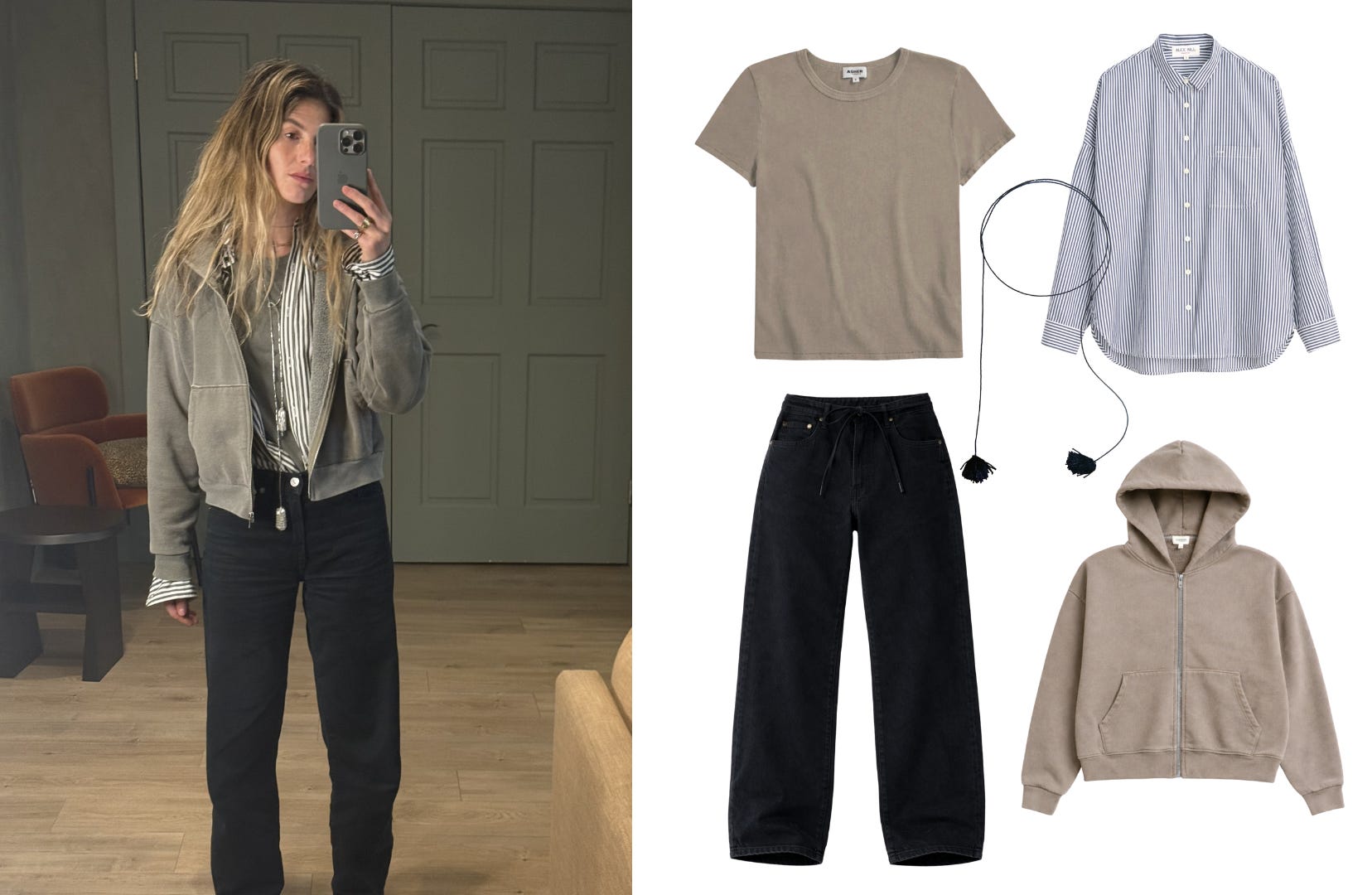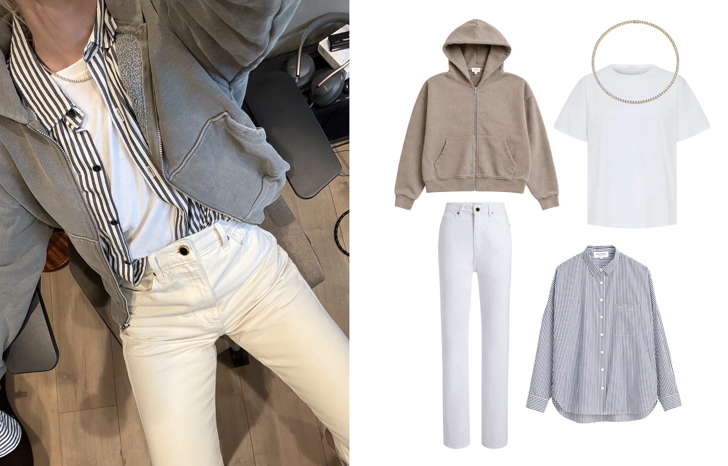 My current obsession is a zip-up sweatshirt. The sandwiched shirt underneath is what saves it. Still comfortable, but polished enough that I don’t feel like I showed up to work in loungewear. The juxtaposition of something sharp (the button-down) with something cozy on top is a win. You look elevated but remain comfortable.