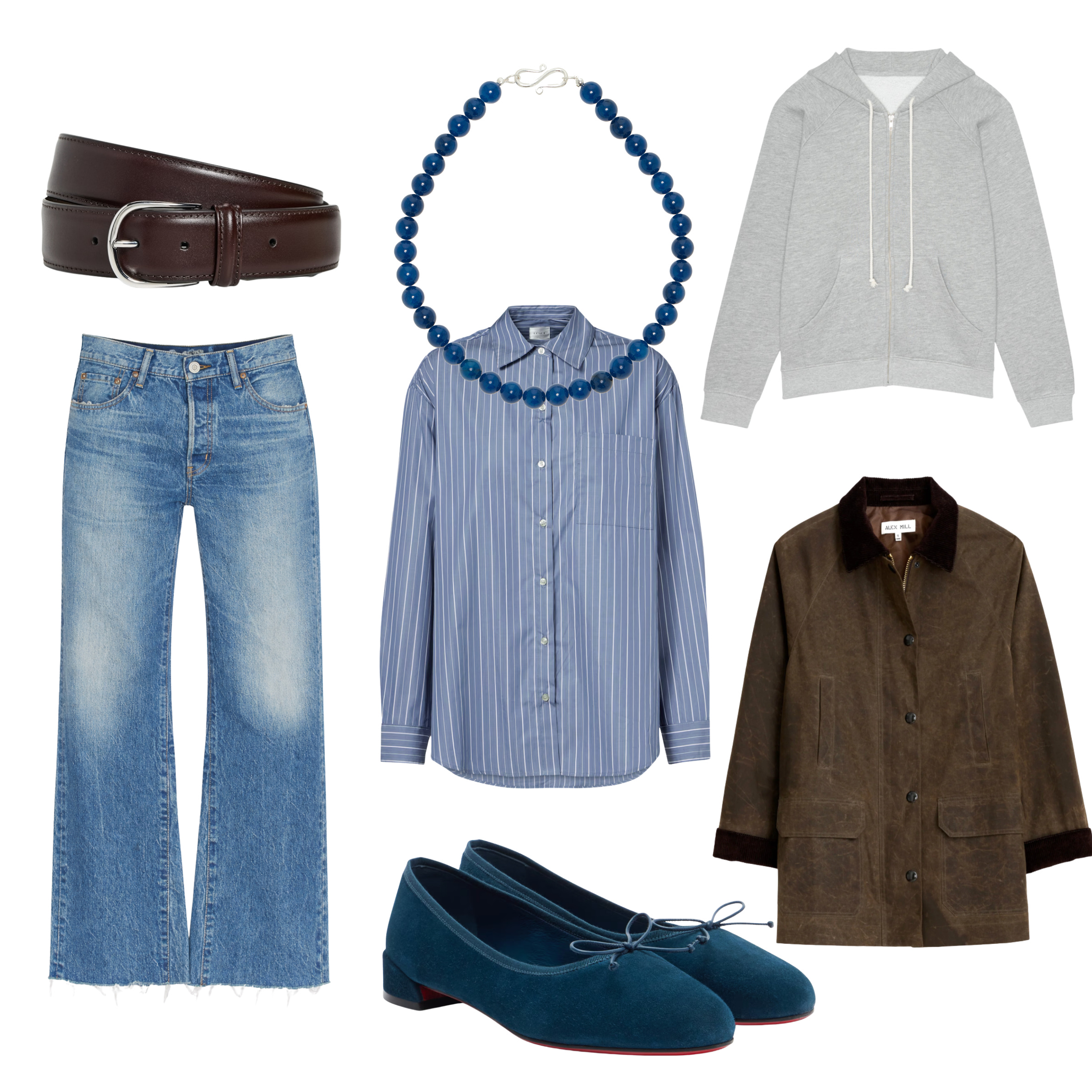 There’s something about a jewel tone against worn-in denim that feels so right. The look plays with brown and blue in different shades and fabrics so it feels layered and considered. I talked about how the blue and brown naturally tend to look great together because of the pigskin top stitching. Layer the buttondown under the zip up. Then the jacket on top.